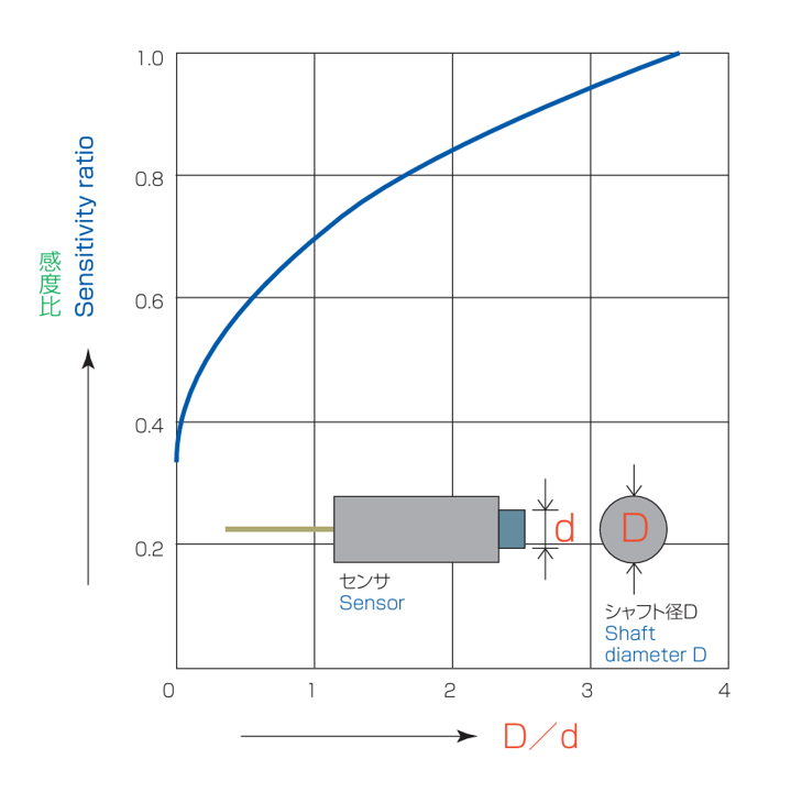 直径のシャフトがこれ以下の場合には測定範囲は低下し、たとえば1:1の場合、測定範囲は約70%となります。